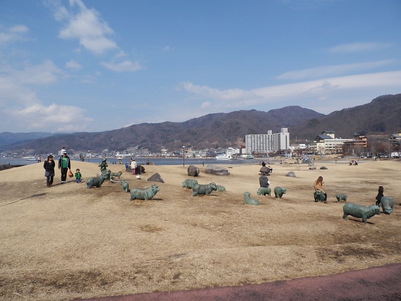 諏訪湖に戻ると... ポカポカ陽気に誘われ、湖畔は家族連れが一杯。