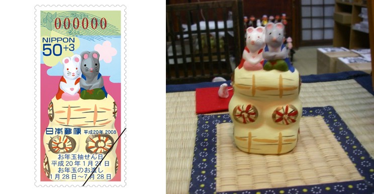 来年(2008年)の年賀切手(50円)のデザインは「米俵の上に座っているちゃんちゃんこを着た夫婦のネズミ」。モデルは旧中山道「奈良井宿」の手作り土産物店「藤屋」で作られてる「ねずみの土鈴」。