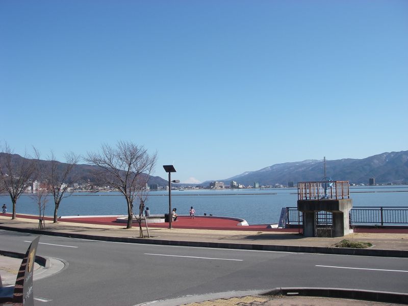 諏訪湖畔にたたずむハーモ美術館。天気がよければ遠くに綺麗な富士山を眺めることができます。