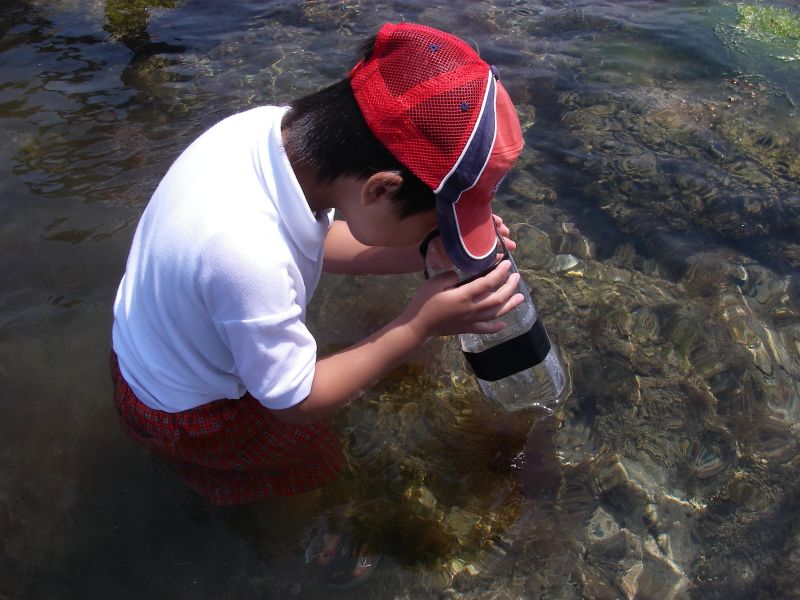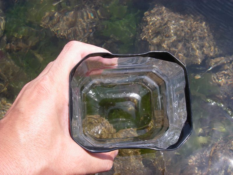 子供達は100円ショップで買ったタモで小さな魚やエビを捕まえたり、自作のアクアスコープ(箱メガネ)で水中観察をして楽しみました。けど、自作のアクアスコープはいまいちでしたねぇ~。ペットボトルの上下を切って、その片側にビニール(サランラップ)を貼り付けた簡単なものなんだけど、水に入れると圧力でビニールがレンズのように撓んでしまって、水中のものがちょっと変形して見えちゃいます。(^^;