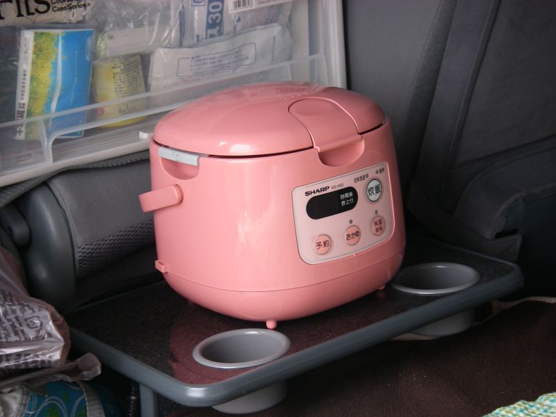 お昼に活躍したのは新兵器の電気炊飯器(リサイクルショップで1500円也)。昼飯は炊き込みご飯とインスタント味噌汁(&ビールがちょびっと)。たったこれだけでも青空の下で食べると美味しいから不思議です。電気炊飯器はこれから結構活躍しそうです。
