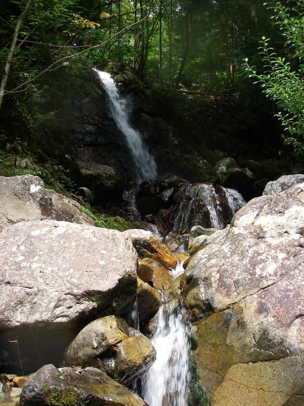 水が綺麗なだけあってヤマメもいっぱい泳いでました(背中に白い斑点があるのがイワナ、黒い斑点があるのがヤマメ)。 ちょっと上流に小さい子供がd遊べるぐらいの広い浅瀬がありました。 横には滝だってあります。