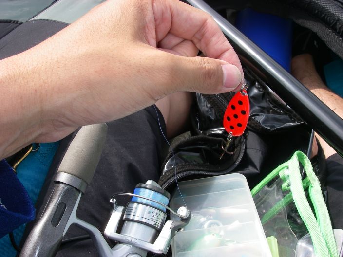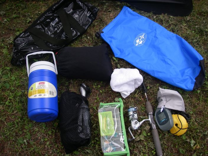 ビニールの大きめのバッグに(防水じゃない普通のバッグ)、昔衝動買いした5000円の魚探、とりあえず持ってきた釣り竿&ルアー、船を固定するためのアンカーセット。
