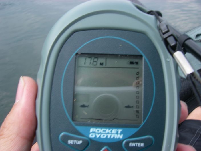 乗って直ぐ、ずっと使ってみたかった魚探を試してみました。最初は水深も魚も表示しないから「騙された!」と思ったけど、岸に近いところに移動したらちゃんと動作しました。(^^)/ 単に水深が測定範囲(最大24m)を超えてただけのようです。
