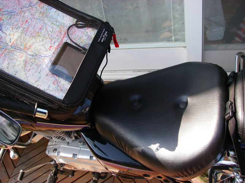 タンクバッグのマップケースに入れたカーナビに電源を接続。