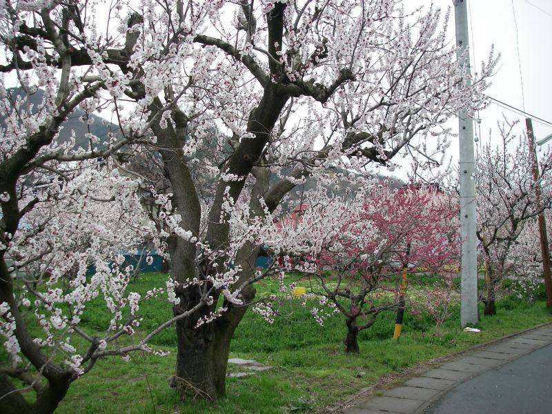 初めてのあんずの里(あんずの里アグリパークでイチゴ狩りをやったことはありますけど)。とりあえず最初に見つけた駐車場に車を止めて散策開始。駐車場から続く小道には数多くの露天と満開のあんずの木が立ち並んでいます。