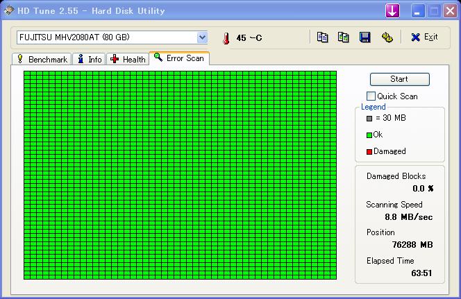 「Ctrl+Alt+Delete」でPCを再起動し、前回と同様HD Tune(フリー版)で不良セクタの分布をみてみると...すごい!不良セクタがなくなってる!