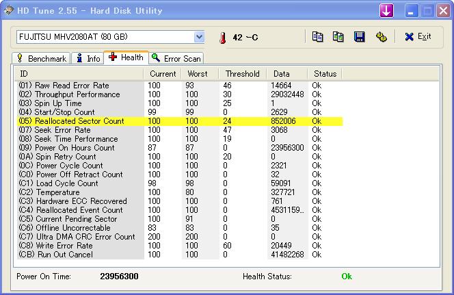しかし、「chkdsk」によるスキャンディスクでは相変わらず「ボリュームビットマップエラーを修復します。」というメッセージ。「chkdsk /r」で修復を試みても状態は変わらず。このエラーと不良セクタは関係ないのか?でも相変わらずS.M.A.R.T情報の05の値は852006と異常に大きいまま。