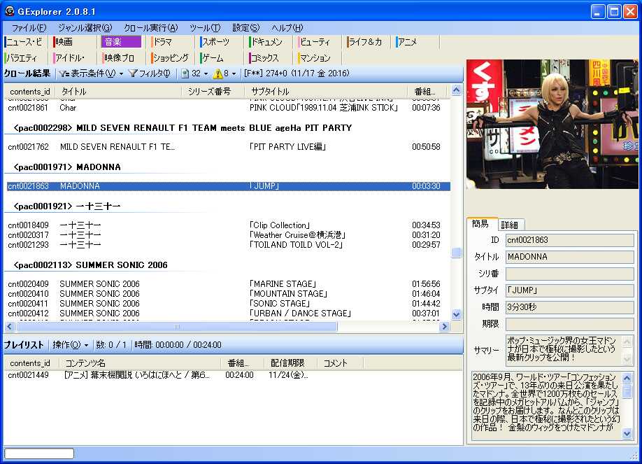 ドラマ、アニメ、映画等の動画を無料あるいは有料で配信する動画サイト。有名処としてはYahoo!動画、BIGLOBEストリーム、Gyaoなんかがあります。この中で俺がよく利用するのはGyao。なんでかというとGExplorerって便利なソフト(当然フリー)があるから。Gyaoの動画リストの一覧をジャンル別に簡単に取得できるから、自分の見たい動画を簡単に探せてすごく便利です。あと...