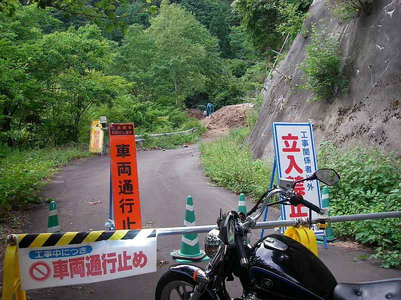 すると、道路が完全に封鎖され強制通行止め(奥が崖崩れ)に!