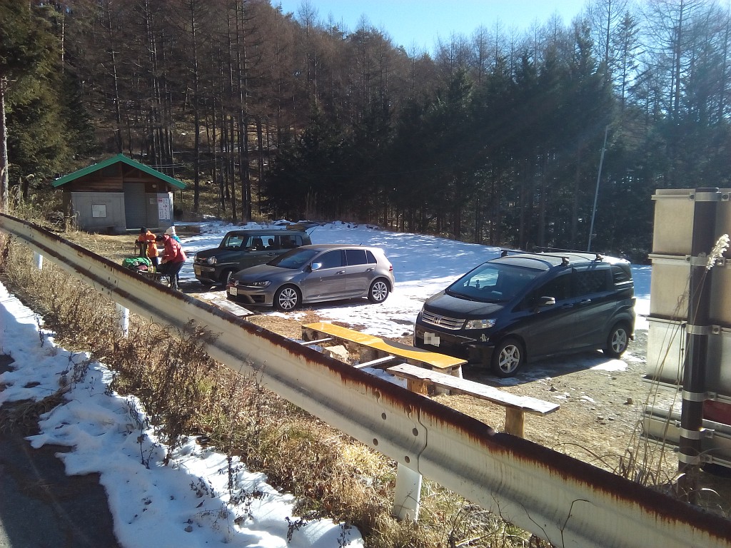 道の所々の残雪が凍って滑りやすく慎重に運転し駐車場に到着。