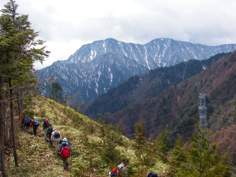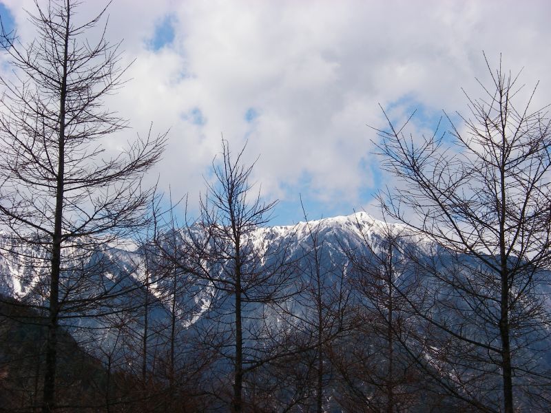まだ雪で覆われた餓鬼岳が遠くに見える。
