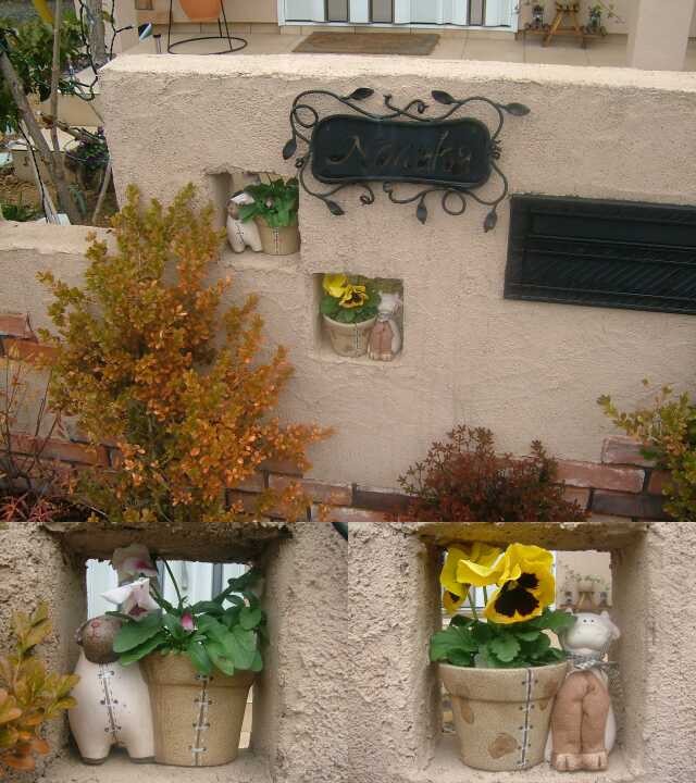 ということでキャラクターポットの定位置が決まって、今は塀の隙間から3匹の動物が顔を出してます。でも既にパンジーが大きくなって苦しそうになってますけど...(^^;