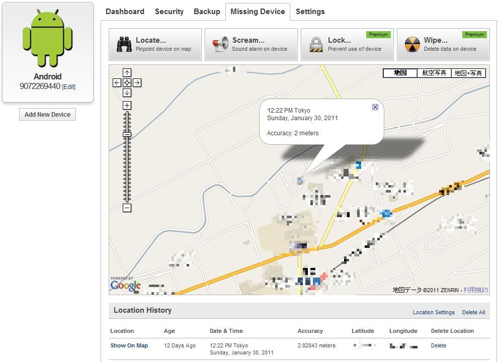 そしてもう一つIS01捜索で有効なGPS探索機能は、Lookout Mobile Securityで実現できる。このアプリは紛失時のGPSによる位置特定だけでなく、ウイルスチェックやバックアップ(連絡先、写真、通話履歴のみ)機能まで付いている。