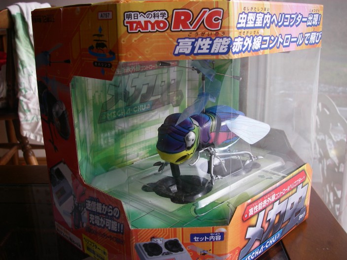 それは「メカ虫RCレインボー」。赤外線のリモコンでコントロールして飛び回るバッタです。玉虫色の体が妙にリアルで気持ち悪いんだけど、ついつい買ってしまいました。(^^;