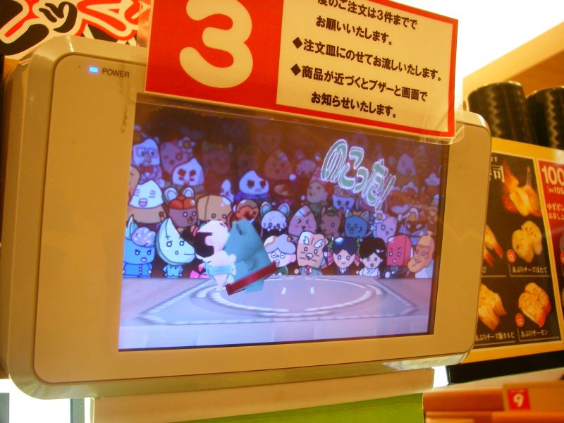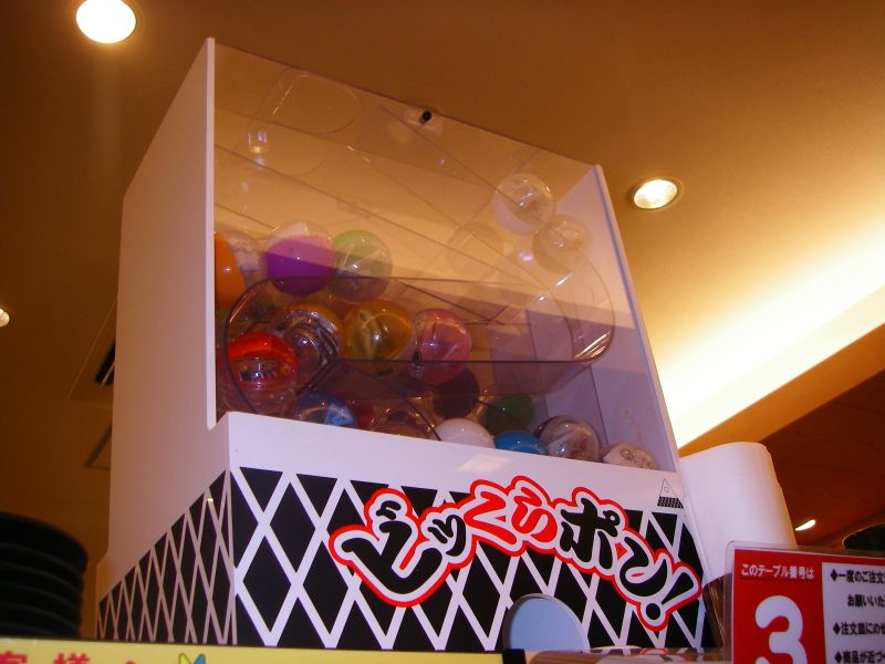 皿投入口に5皿入れる毎にゲームが1回できる。ゲームはスロットマシンと魚釣りゲームと相撲ゲームの3種類で(交互に変わる)、魚釣りと相撲ゲームは三択になっている。当たりはガチャガチャで貰える様なカプセルに入った玩具。この日は27皿食べて、ゲームに5回チャレンジしたが残念ながら全敗!これが目的で来た様なもんだからすごく残念(T-T)。