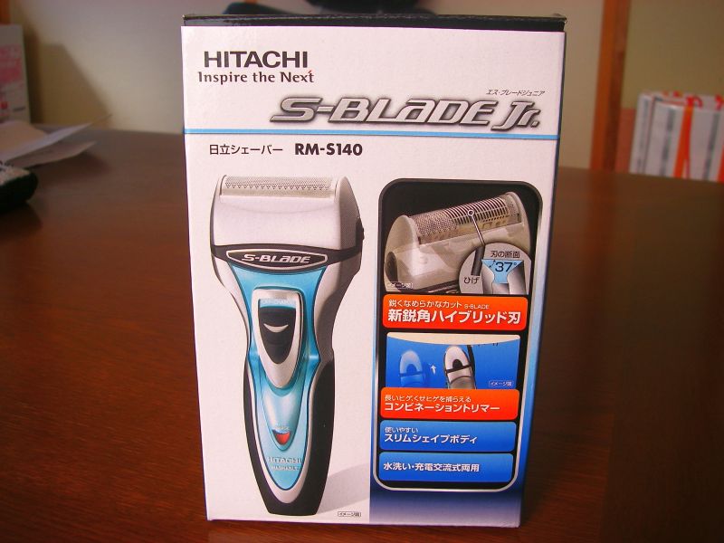 価格.comを調査し、リーズナブル(3000円程度)で評判の良い日立 S-BLADE Jr. RM-S140を選定。2枚刃や3枚刃も考えたが、髭は標準より薄いし、刃交換時のコスト(外刃、内刃共1000円程度)も考えて1枚刃とした。