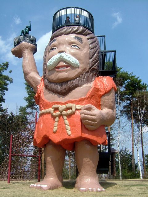 頂上に「でいだらぼっちゃ」の大きな像がある公園で、ボブスレーやジャンボ滑り台なんかが楽しめる場所だけど、まだオープンしてないみたいで、頂上には同じ目的の家族連れが少し居る程度でした(下の公園はいっぱい人が居ました)。