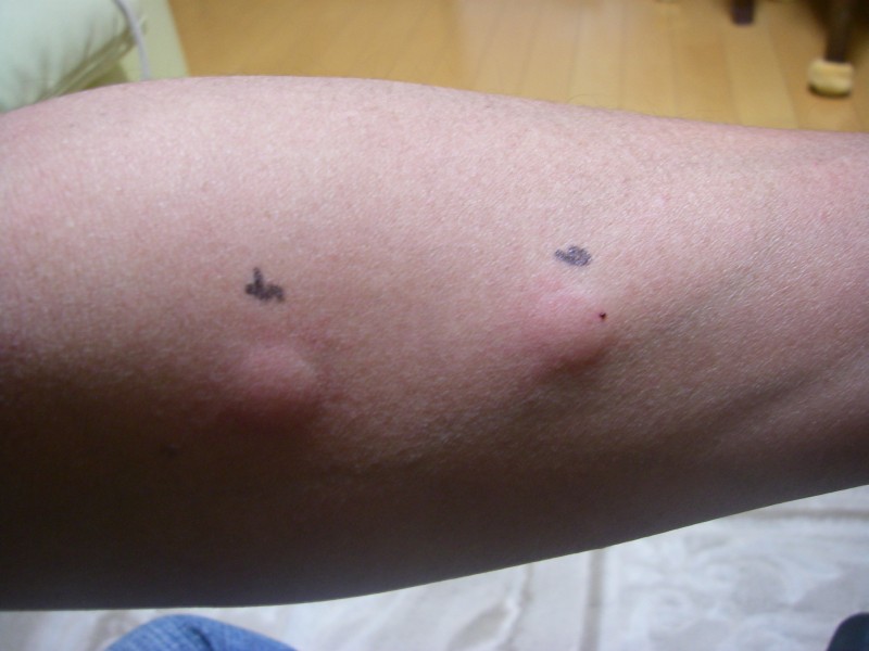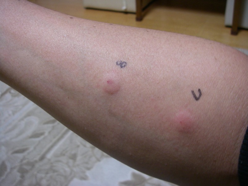 自分の場合、10^5、10^6、10^7、10^8という4種類の濃さのエキスを皮内へ注射。10^5が一番濃いらしいんで、この数値は薄め具合を示してるんでしょうね(10^5は100000倍に薄めてるってこと?)。