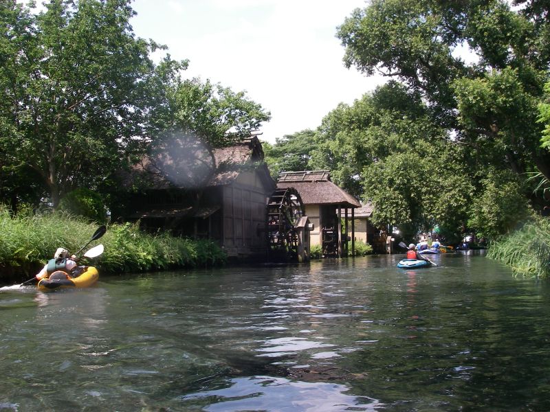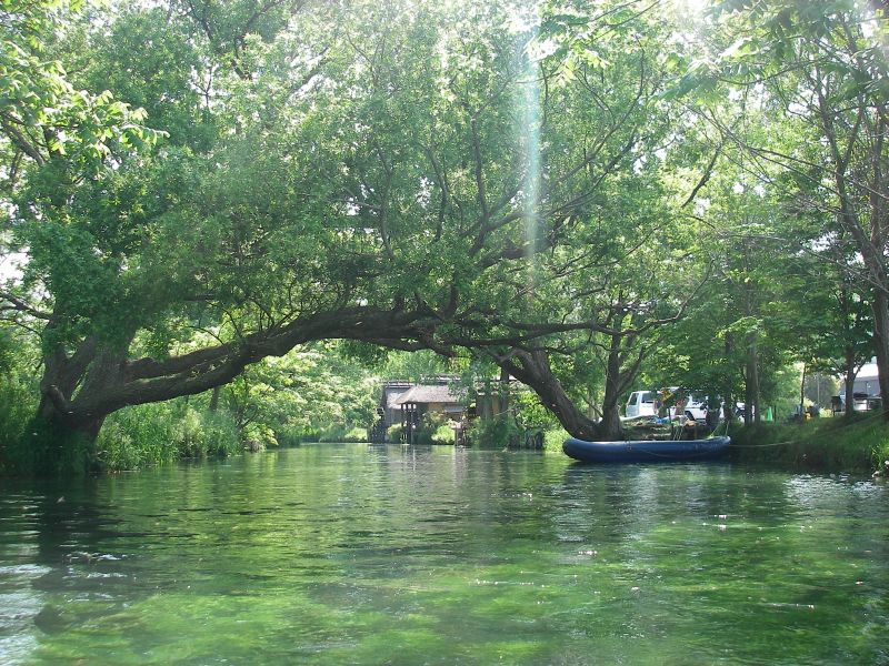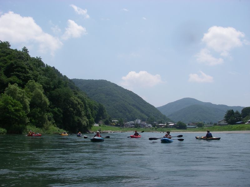 「お~い、こっちだよぉ~!」と呼びかけるものの全く気付かずどんどん下流へ。こりゃマズイ。(^^; 急いで本流に戻り必死のパドリングで前の艇に向かいながら声を出し続けると、ようやく気付いて止まってくれました。でもその場所は大王わさび農場から300mも下流。更に悪いことにもう一艇○○さんの艇もここまで流れてきちゃいました。(^^;
