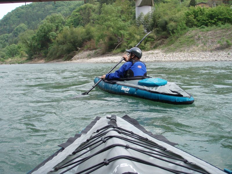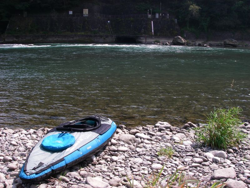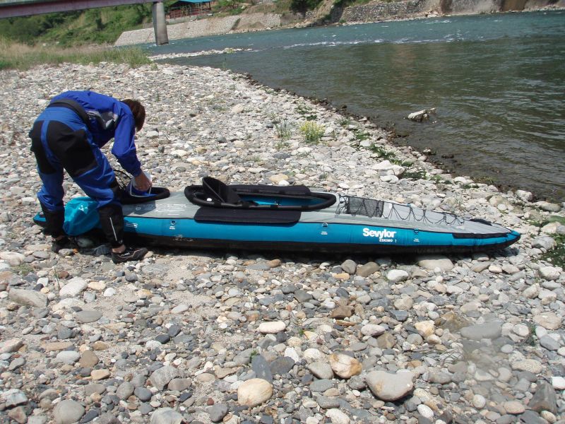 そるとさんに相談すると、「以前魚野川で片側のフロアチューブが潰れた状態で下ったけど大きな問題はなかった」とのこと。しょうがないんで覚悟を決めて片側のフロアチューブに空気が全く入ってない状態で下ることに。