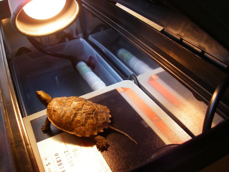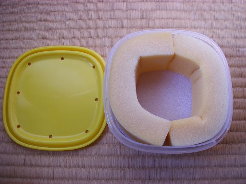 [移動時] カメちゃんはスポンジを敷き詰めたタッパでお休み。