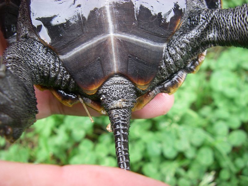 メス♀ ----- しっぽが細くて短い。肛門の位置が甲羅から近い。