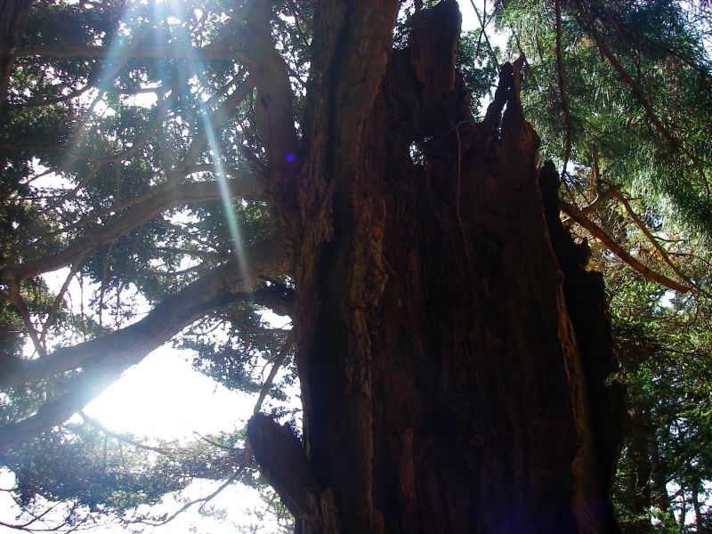 神社入口の石の壁には三体の仏様。それに朽ち果てた大木。