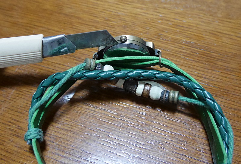 使ったのはカッターナイフ。薄い刃先を隙間に押し込み(通常こじ開け口という、一箇所薄く隙間が開けてある部分があるらしいが、この時計はとくにそういう部分はなかったので、適当な場所に押し込んだ)、隙間を開く方向にちょっと力を入れる(この要領でグルっと一周刃を入れこじ開ける)。