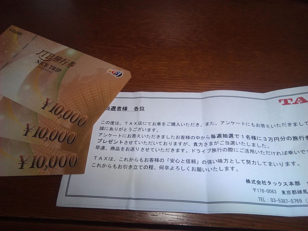 「オートガレージ弁慶 来夢店」は、別名「TAX来夢」とも呼ばれてる訳で(正式名称は?)、つまり全国展開しているタックスグループの一つって事になる。そのタックスルグループのサービスの一貫で、「毎週1名に抽選で3万円の旅行券をプレゼント」ってのがあるらしい。いつどんなアンケートだったかは覚えてないが...(^^;