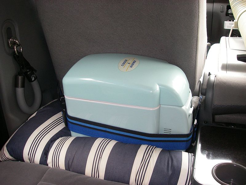 設置場所は助手席の後ろ。100円ショップで購入したスーツケースベルトで助手席のシートに固定しており、必要に応じて簡単に移動することができる。 ちなみに保冷時の消費電力は38-68W(保温時は30-55W)で、平均53W(4.42A)とし補助バッテリーでの動作可能時間を計算すると17時間となり、Pキャンでも一晩(例えば17:00~8:00なら15時間)持つことになる。具体的計算は以下の通り。