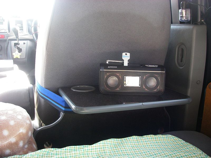 補助テーブルの後に設置されたコンパクトテーブルは、ほぼセカンドシートと同じ高さで、飲食をするには少し低すぎ、やや使い辛い感じがあった。また、テーブルを留めているボルト(補助シートのシートベルト取り付け用)のネジがバカになってきたこともあり、テーブルの位置を運転席の後に移動してみることにした。