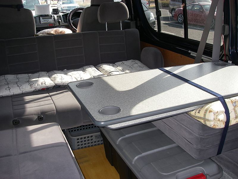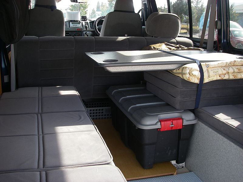 セカンドシートの後ろは常時レストルーム。レストルームへは、セカンドシートの背もたれを乗り越えるか、バックドアを開いて後ろから移動する。テーブルの下には、バックドアから乗り込む際にステップ代わりになるRVボックス(収納ボックス)と、外で使える簡易折り畳みテーブル(自作)を置いている。