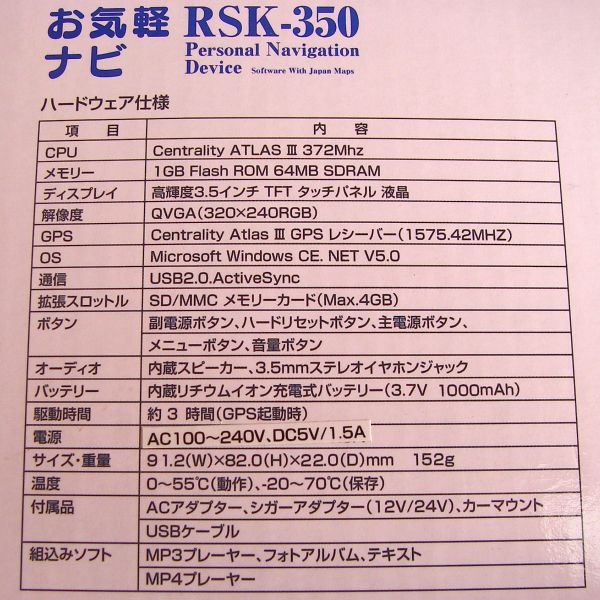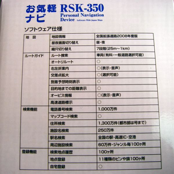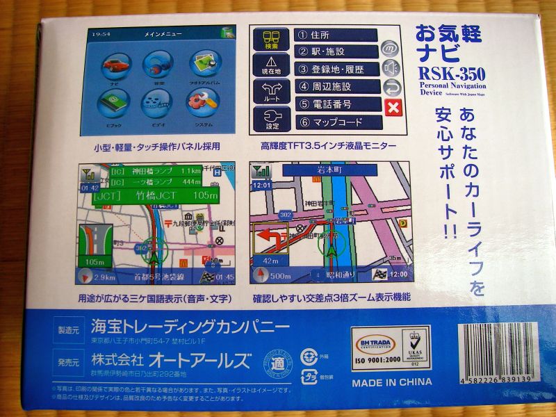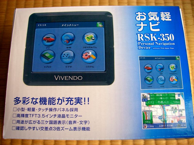 と思ったが、瓜二つのGN-350というカーナビはオークションで1万円程度で落札されてる様である。ちなみにRSK-350は、海宝トレーディングカンパニーという全然知らない会社が製造元(MAID IN CHINA)。オートアールズが販売元となっている。たぶんTNK-350(販売終了品)のオートアールズ限定型式なんだろうなぁ。でもDisplay下のVIVENDOって何?