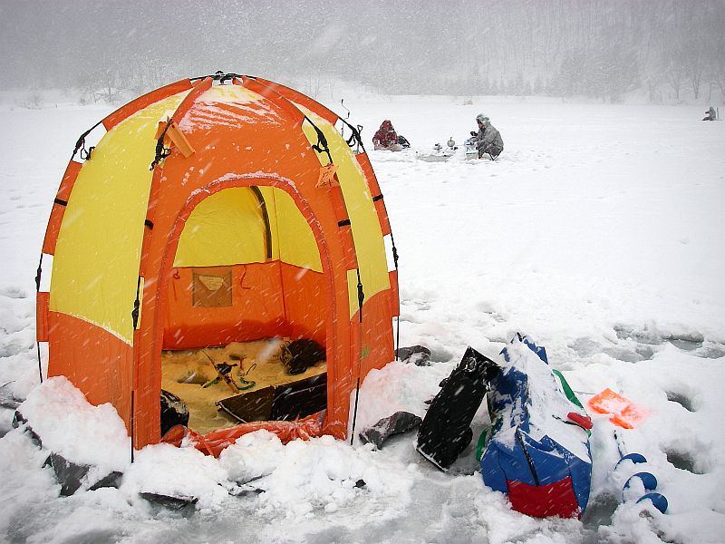 2匹目を釣り上げたところで、雪が激しくなり、この雪の中で長時間釣り続けるのは困難と判断し、数シーズン振りにテントを広げることにした。