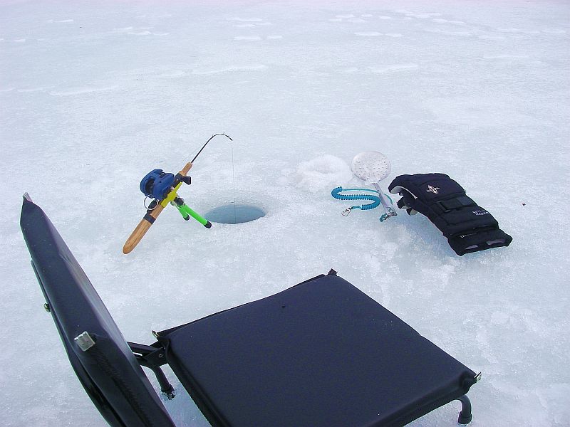 すでに穴が2個開いた場所を見つけ。一箇所はわかさぎ仕掛け、そしてもう一箇所にはマス専用仕掛けを垂らす。