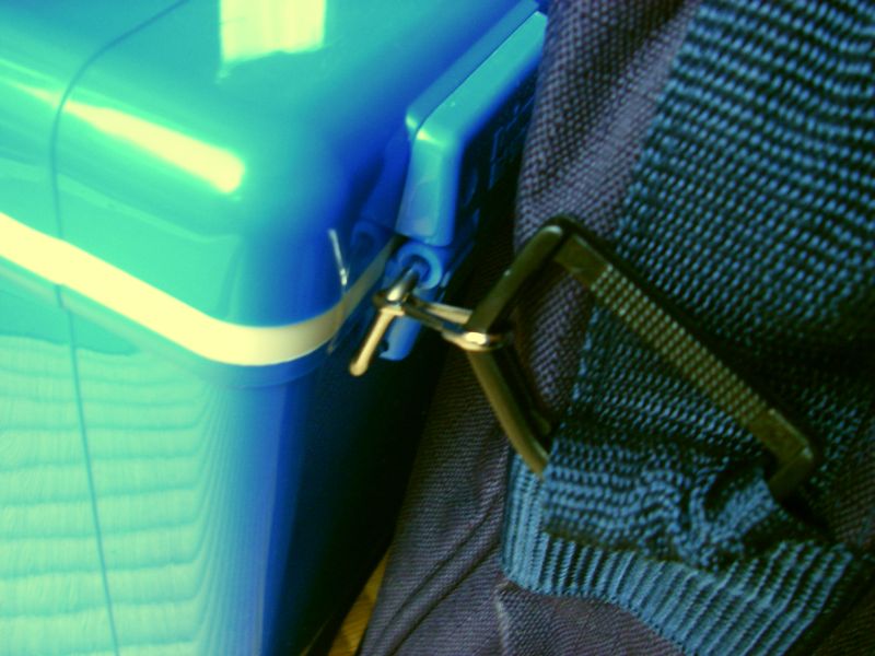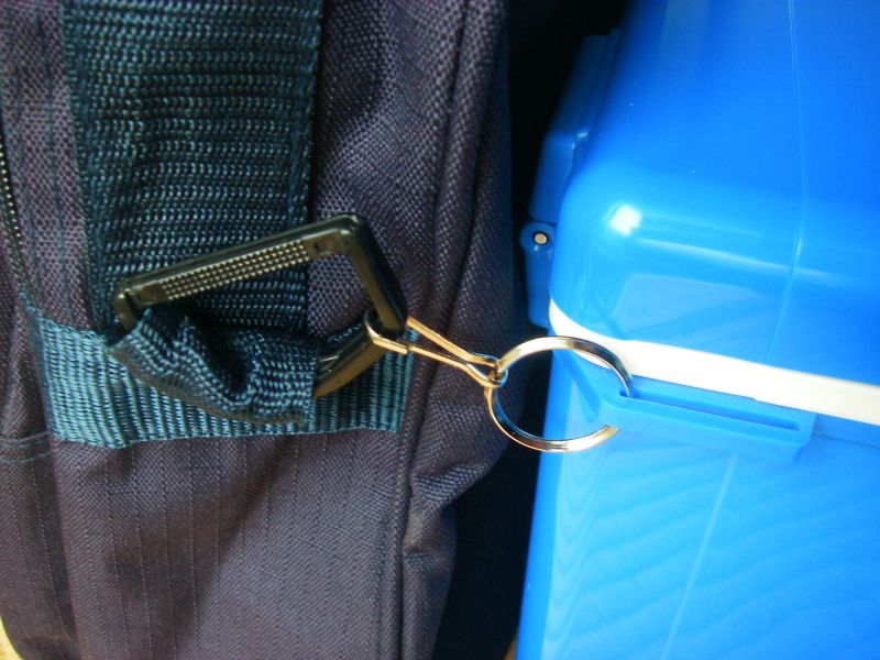 そこで付属のベルトの繋ぎ方をちょっと変えてクーラーボックスに巻きつけてみた。クーラーボックスとバッグの取っ手はバッグ付属のマジックテープ式取っ手まとめで合体。バッグにどんな重いものを入れてもここを持てばクーラーボックスに無理な負荷がかかることは無い。