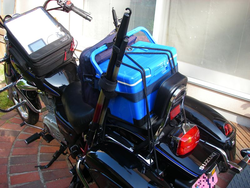 空いた左手で投げ釣り用のリール&ロングロッドを持つ。肩掛けベルトをクーラーボックスに取り付ければ、持ち運びはもっと楽になるだろうが、長い距離を歩くことは少なく、バイク搭載時にすっきりした形になる様、肩掛けベルトは取り外している。