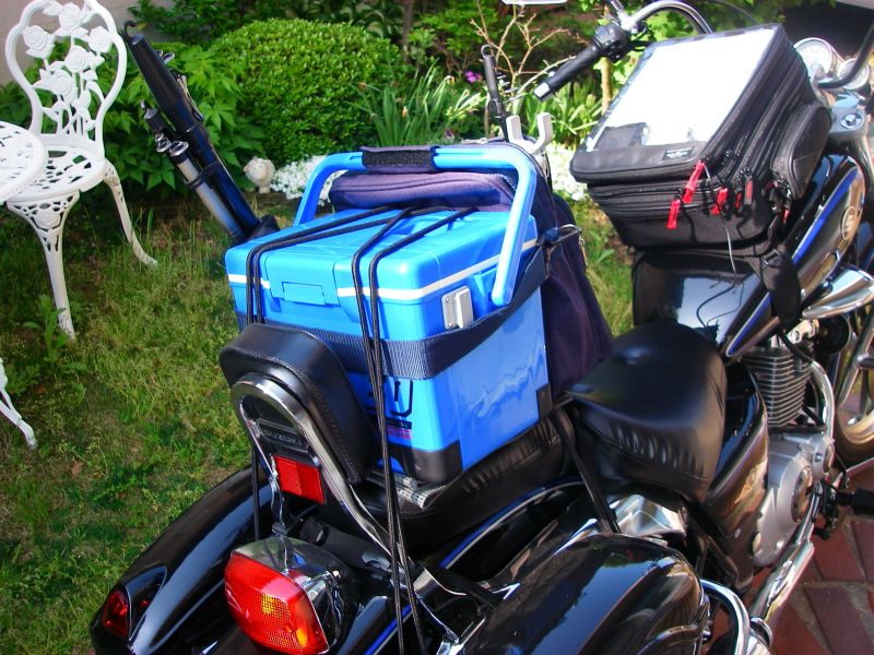 まず一番重要なクーラーボックスの選定。バイクの後部シートにピッタリ乗る大きさはシマノレジャークール7程度の大きさ(約20×31×21(H)cm)。これくらいコンパクトで保冷性の良いフィッシングクーラーという基準で選んだのがダイワ精工(DAIWA)のプロバイザーGXU-60(23×33.5×23(H)cm)。購入先は山とアウトドア専門店 ロッジ(会員になれば3割引で購入できる)。色はライムグリーン(現行モデルはイエローに変更)が可愛いと思ったが、結局バイクの色に合せてネイビーブルーをチョイス。