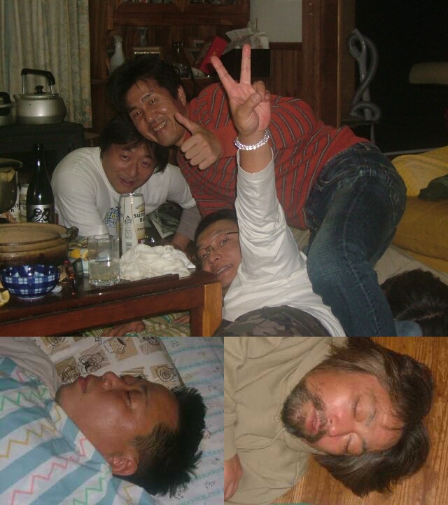 昨日は平日なんで全員集合したのがPM9:00。それから延々AM4:00まで宴会は続きました(でも写真のように何人かは途中でおやすみしちゃいました)。