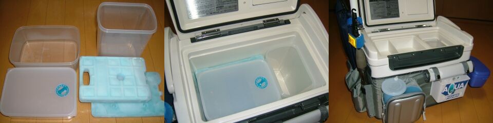 購入してまず最初に考えたことは内部の効率的な利用。さっそくメジャーを持って100円ショップへGo!まず選んだのは魚投入口の下に置く魚の入る縦長のタッパ。これがあればクーラーボックスが魚で汚れず後処理が簡単。次にビール入れ用のタッパ。選んだのはビールが横に丁度3本入るタッパ。あとビール入れのタッパの上の空間に収まるタッパ。それに保冷剤1個。3つのタッパ&保冷剤1個+もともと持ってた保冷剤1個は、なんとこのクーラーボックス用に作られたオプションじゃないかと思うくらいピッタリ!