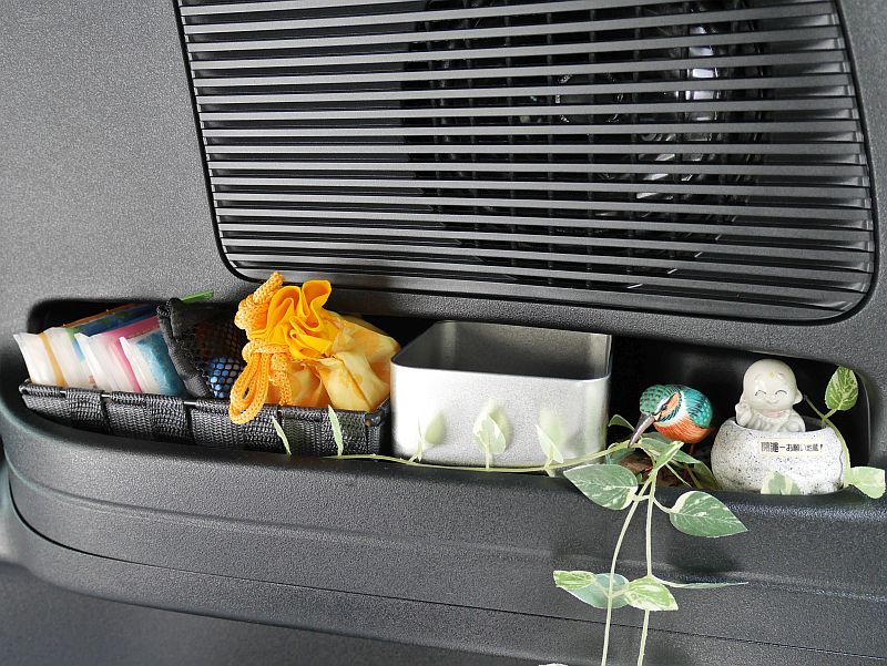 ポケットのポータブル電源前後の隙間には手持ちの小物入れと100均の籠を使い付属部品をすべて収納。一つの機能を一箇所に集約し管理や使い勝手もバッチリである。