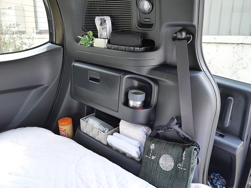 (後部座席を助手席側だけフラットにし、フラット面に長座布団を2枚敷く)
