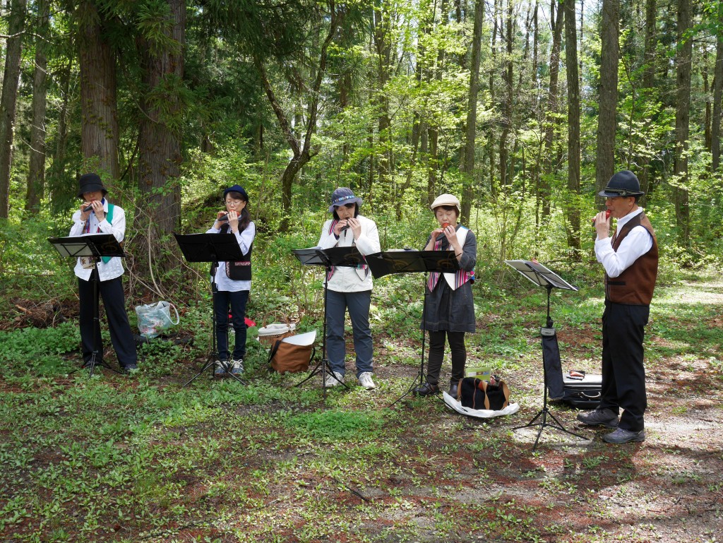 樹木を縫う小道の脇でのオカリナ演奏。新緑と癒しの音色が相まって心に染み渡る。