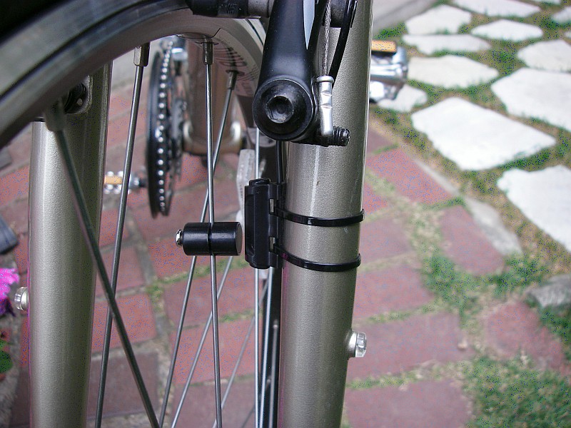 センサ取り付けのポイントはマグネットとセンサの距離(2mm±1mm)だが、近過ぎると前輪を取り外す際マグネットとセンサが当たる可能性があるため、ちょっと離し気味に取り付けた。またマグネットとセンサを水平する(フォークの形状とスポークの向きが原因)ためセンサ上部に両面テープを1枚重ね取り付けた。