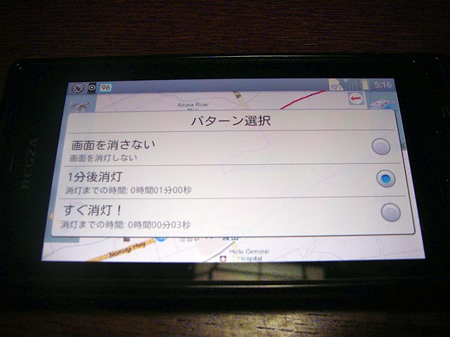 ⇒ステータスバーを下げ、画面消灯設定呼び出しを起動→「1分後消灯」を選択