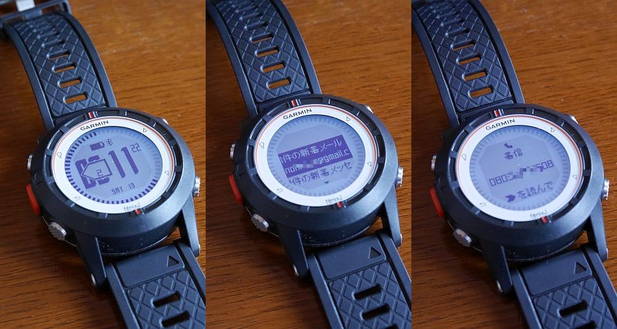 ①については、設定にBluetoothメニューが追加されており、事前にスマホとペアリングしておけば、メールや電話が着信するとfenixJの画面にその旨が表示される。