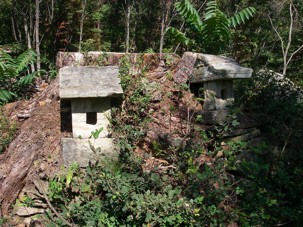 道路の右手、伐採された巨木の根元に2つの小さな祠? 放置感が寂しい...《12:20》