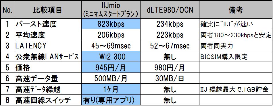 ◎月の高速データ量は、OCNが900MB(30MB*30日)に対し、IIJは500MBと少ないが、IIJは1ヶ月の繰越ができるため、前月の使用量がなかった場合翌月は1GBになる