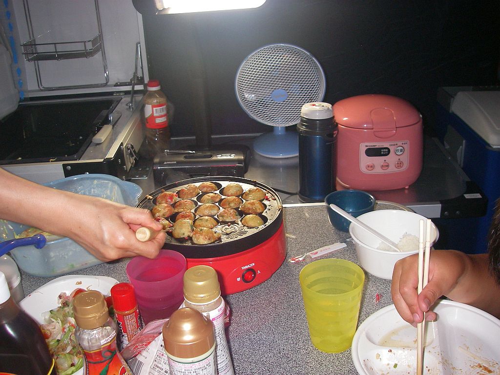 夕食: たこ焼き、バーベキュー、サラダ、デザート(マシュマロ)